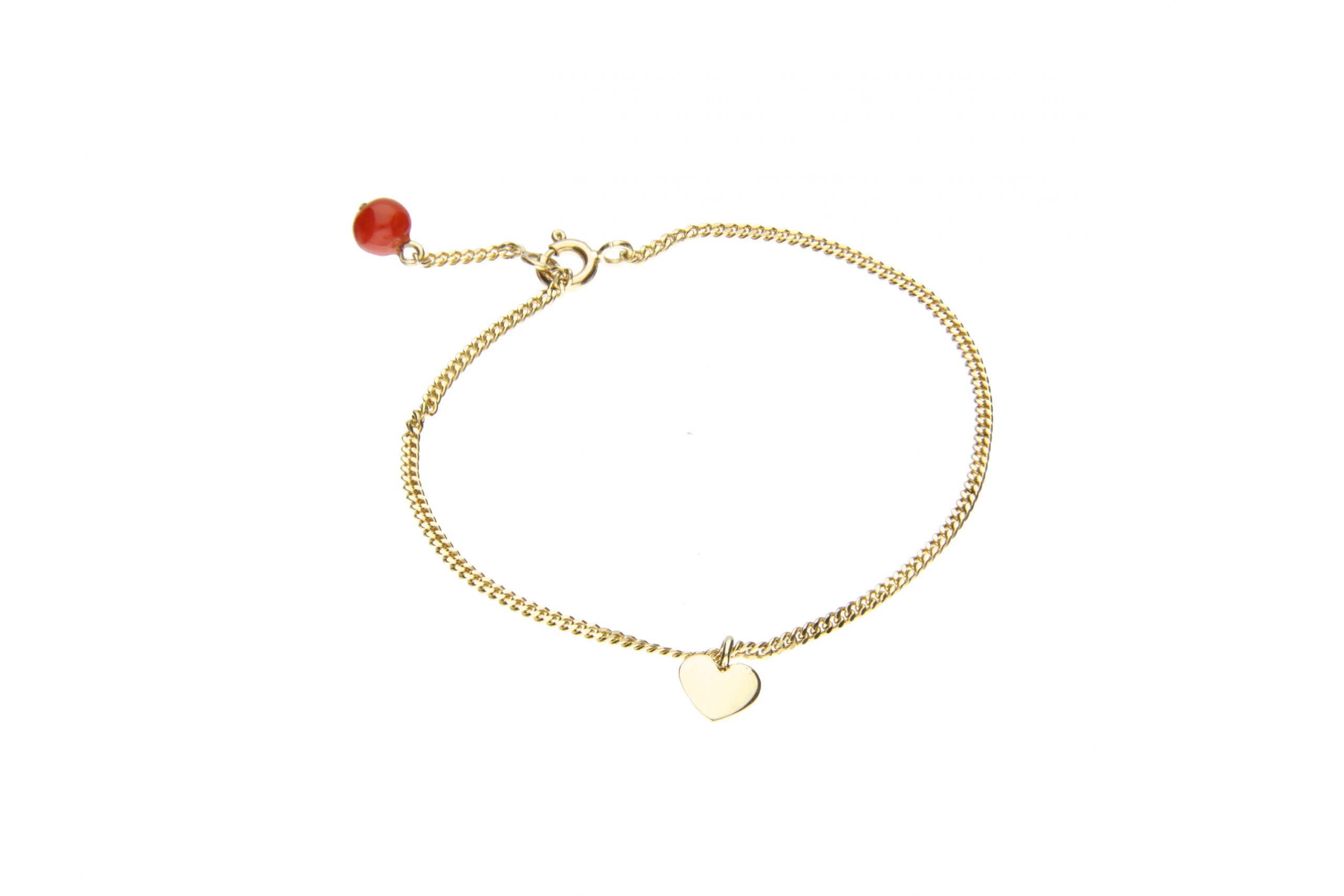 zartes Panzerarmband aus 333 Gelbgold mit einem kleinen Herzanhänger und Korallkugel am Verschluss.